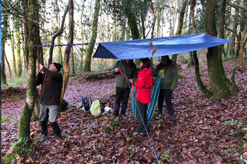 Túra után ponyvát húztunk a függőágyunk fölé és mindenki kipróbálta hogyan kell a hálózsákba bemászni.